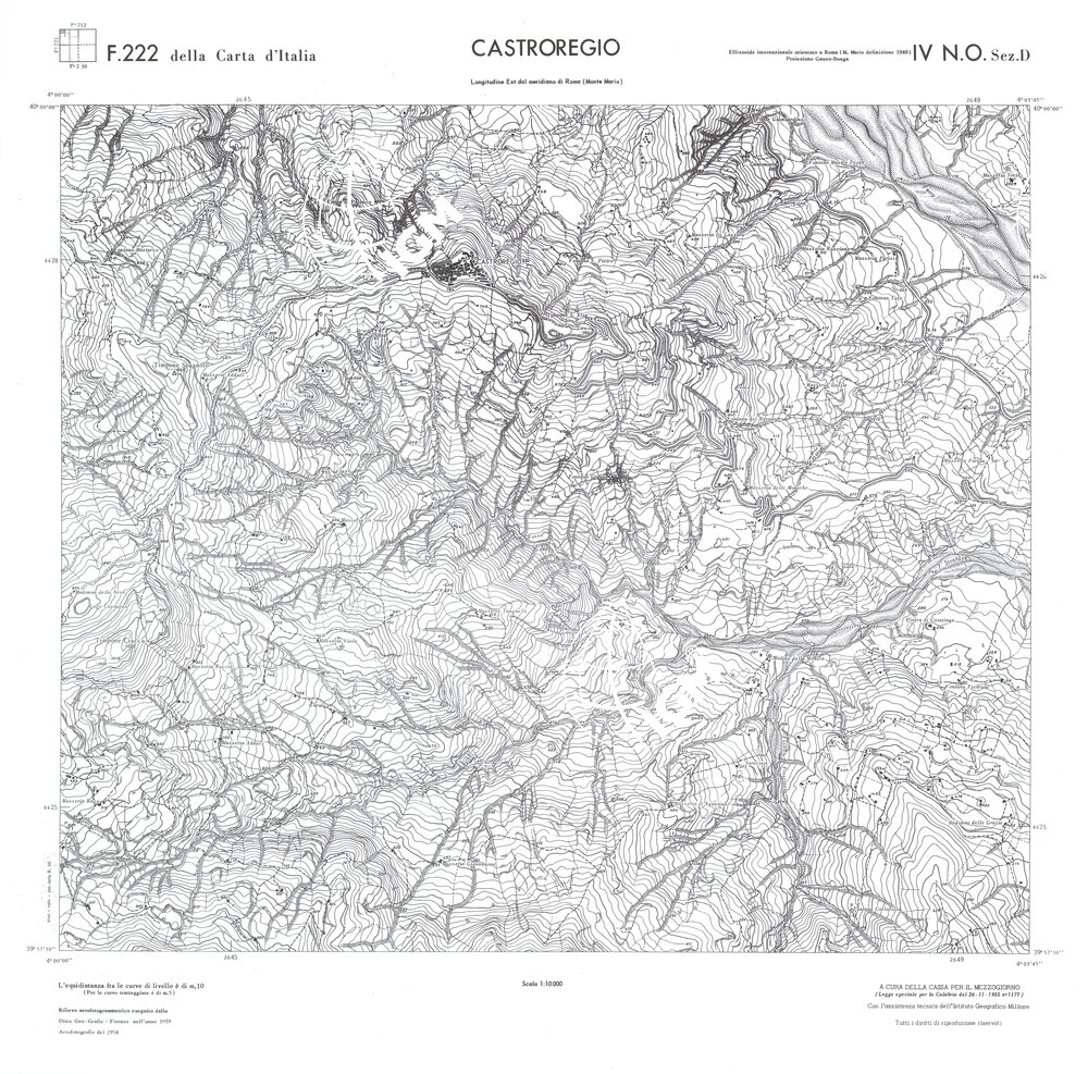 Rilievo eseguito da ditte private a cura della Cassa per il Mezzogiorno (legge speciale per la Calabria 26/11/1955 n°1177) con l’assistenza tecnica dell’ I.G.M. Rilievo aereofotogrammetrico,proiezione naturale,stampa in nero,equidistanza tra le curve mt.10. Le fotoriprese aeree furono eseguite nel 1954, l’elemento cartografico era la sezione di tavoletta, ossia 1/4 di tavoletta, distinta dalle lettere A;B;C;D.
