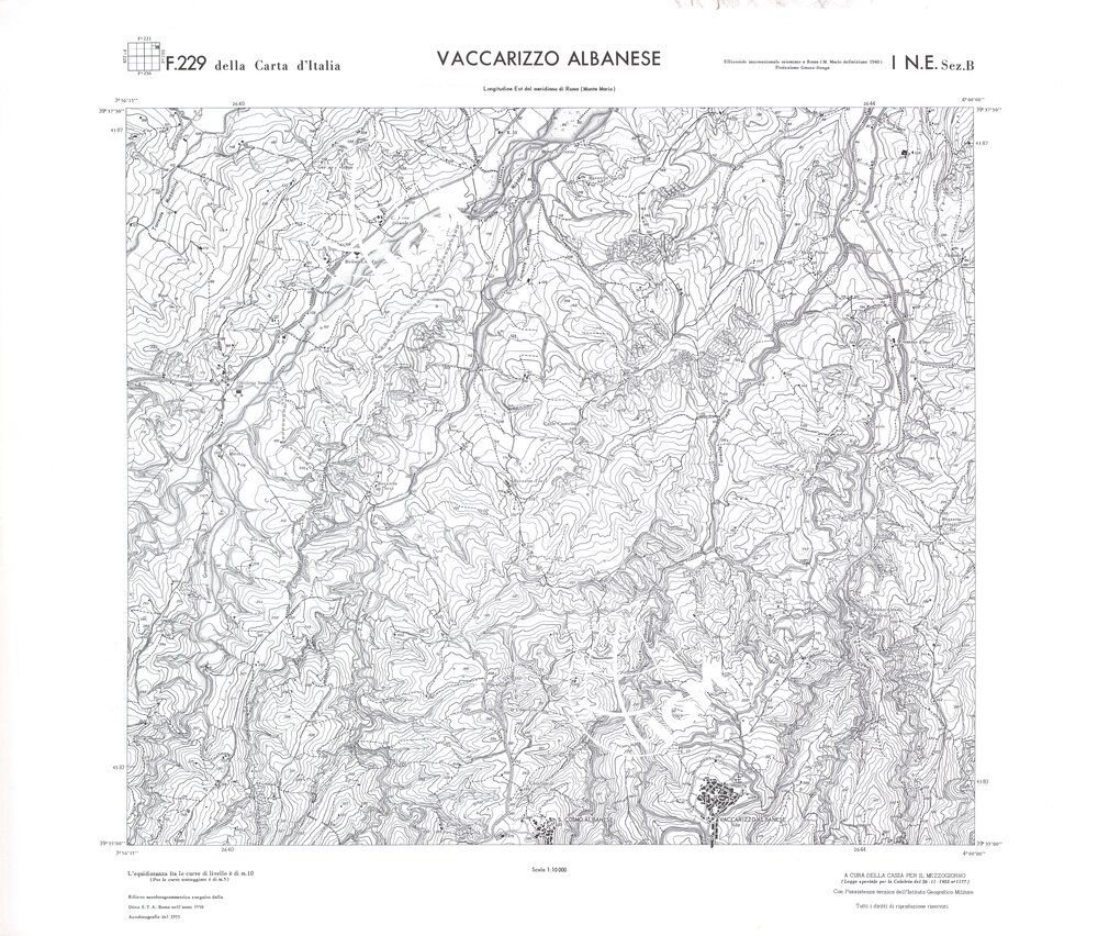 Rilievo eseguito da ditte private a cura della Cassa per il Mezzogiorno (legge speciale per la Calabria 26/11/1955 n°1177) con l’assistenza tecnica dell’ I.G.M. Rilievo aereofotogrammetrico,proiezione naturale,stampa in nero,equidistanza tra le curve mt.10. Le fotoriprese aeree furono eseguite nel 1954, l’elemento cartografico era la sezione di tavoletta, ossia 1/4 di tavoletta, distinta dalle lettere A;B;C;D.