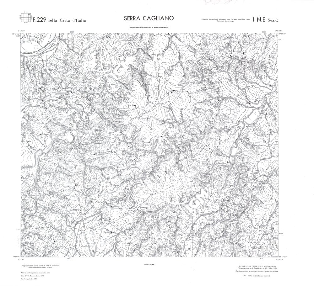 Rilievo eseguito da ditte private a cura della Cassa per il Mezzogiorno (legge speciale per la Calabria 26/11/1955 n°1177) con l’assistenza tecnica dell’ I.G.M. Rilievo aereofotogrammetrico,proiezione naturale,stampa in nero,equidistanza tra le curve mt.10. Le fotoriprese aeree furono eseguite nel 1954, l’elemento cartografico era la sezione di tavoletta, ossia 1/4 di tavoletta, distinta dalle lettere A;B;C;D.