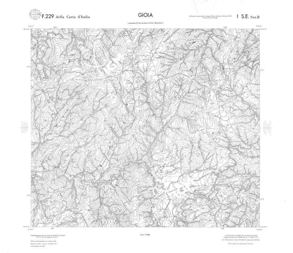 Rilievo eseguito da ditte private a cura della Cassa per il Mezzogiorno (legge speciale per la Calabria 26/11/1955 n°1177) con l’assistenza tecnica dell’ I.G.M. Rilievo aereofotogrammetrico,proiezione naturale,stampa in nero,equidistanza tra le curve mt.10. Le fotoriprese aeree furono eseguite nel 1954, l’elemento cartografico era la sezione di tavoletta, ossia 1/4 di tavoletta, distinta dalle lettere A;B;C;D.