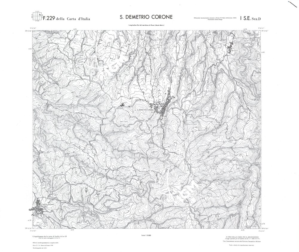 Rilievo eseguito da ditte private a cura della Cassa per il Mezzogiorno (legge speciale per la Calabria 26/11/1955 n°1177) con l’assistenza tecnica dell’ I.G.M. Rilievo aereofotogrammetrico,proiezione naturale,stampa in nero,equidistanza tra le curve mt.10. Le fotoriprese aeree furono eseguite nel 1954, l’elemento cartografico era la sezione di tavoletta, ossia 1/4 di tavoletta, distinta dalle lettere A;B;C;D.