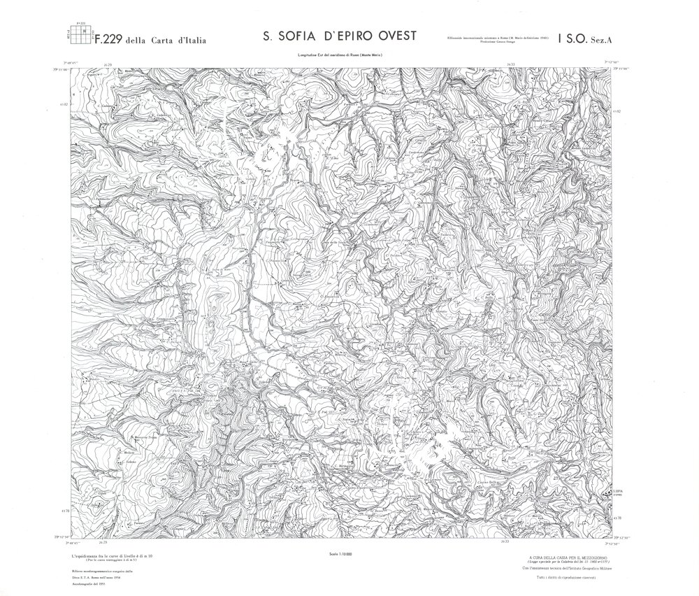 Rilievo eseguito da ditte private a cura della Cassa per il Mezzogiorno (legge speciale per la Calabria 26/11/1955 n°1177) con l’assistenza tecnica dell’ I.G.M. Rilievo aereofotogrammetrico,proiezione naturale,stampa in nero,equidistanza tra le curve mt.10. Le fotoriprese aeree furono eseguite nel 1954, l’elemento cartografico era la sezione di tavoletta, ossia 1/4 di tavoletta, distinta dalle lettere A;B;C;D.