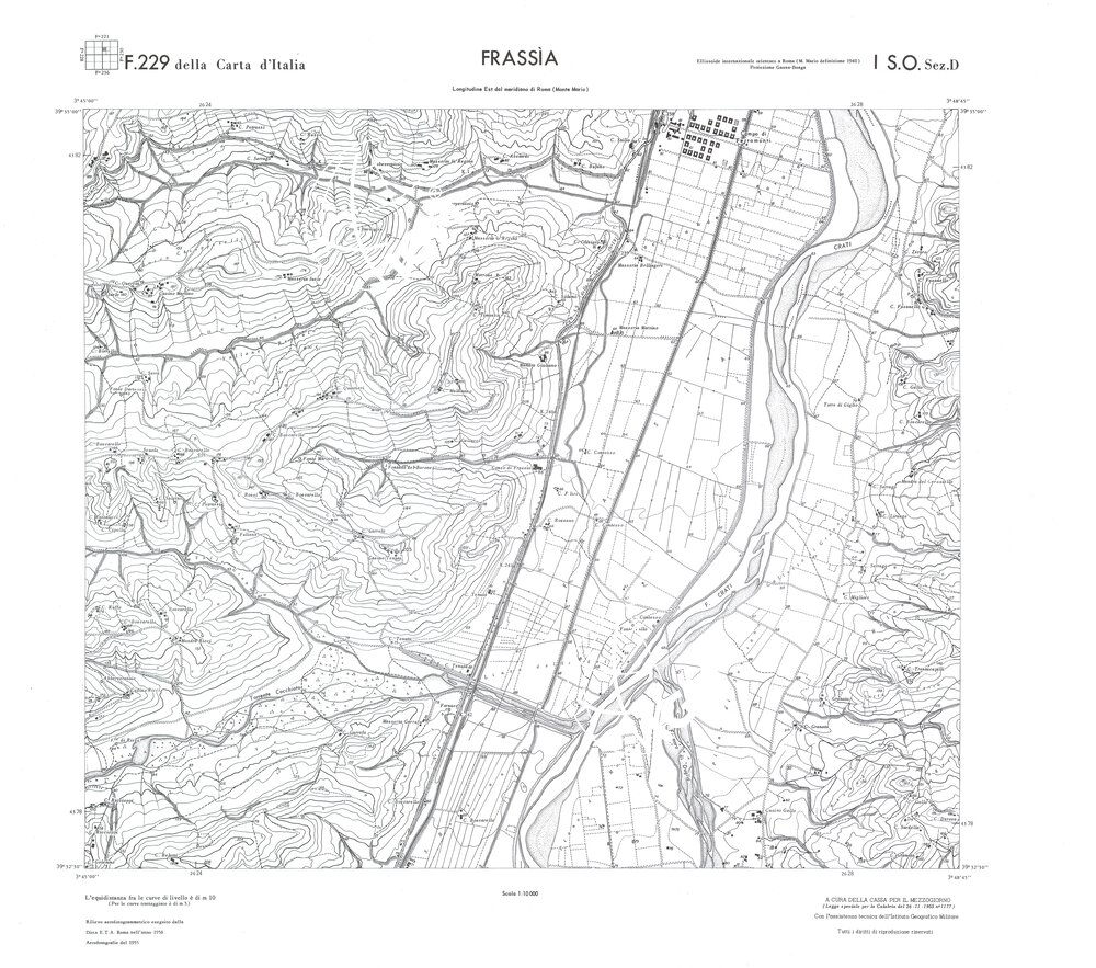 Rilievo eseguito da ditte private a cura della Cassa per il Mezzogiorno (legge speciale per la Calabria 26/11/1955 n°1177) con l’assistenza tecnica dell’ I.G.M. Rilievo aereofotogrammetrico,proiezione naturale,stampa in nero,equidistanza tra le curve mt.10. Le fotoriprese aeree furono eseguite nel 1954, l’elemento cartografico era la sezione di tavoletta, ossia 1/4 di tavoletta, distinta dalle lettere A;B;C;D.