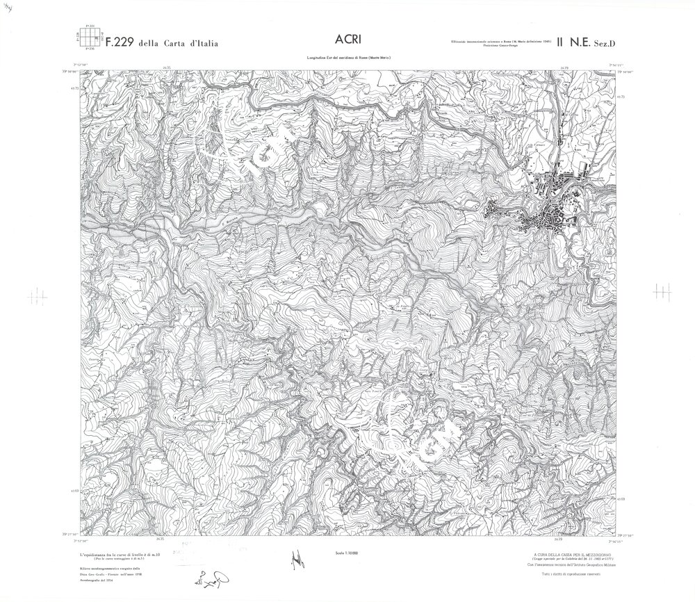 Rilievo eseguito da ditte private a cura della Cassa per il Mezzogiorno (legge speciale per la Calabria 26/11/1955 n°1177) con l’assistenza tecnica dell’ I.G.M. Rilievo aereofotogrammetrico,proiezione naturale,stampa in nero,equidistanza tra le curve mt.10. Le fotoriprese aeree furono eseguite nel 1954, l’elemento cartografico era la sezione di tavoletta, ossia 1/4 di tavoletta, distinta dalle lettere A;B;C;D.
