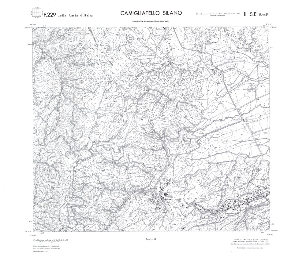 Rilievo eseguito da ditte private a cura della Cassa per il Mezzogiorno (legge speciale per la Calabria 26/11/1955 n°1177) con l’assistenza tecnica dell’ I.G.M. Rilievo aereofotogrammetrico,proiezione naturale,stampa in nero,equidistanza tra le curve mt.10. Le fotoriprese aeree furono eseguite nel 1954, l’elemento cartografico era la sezione di tavoletta, ossia 1/4 di tavoletta, distinta dalle lettere A;B;C;D.