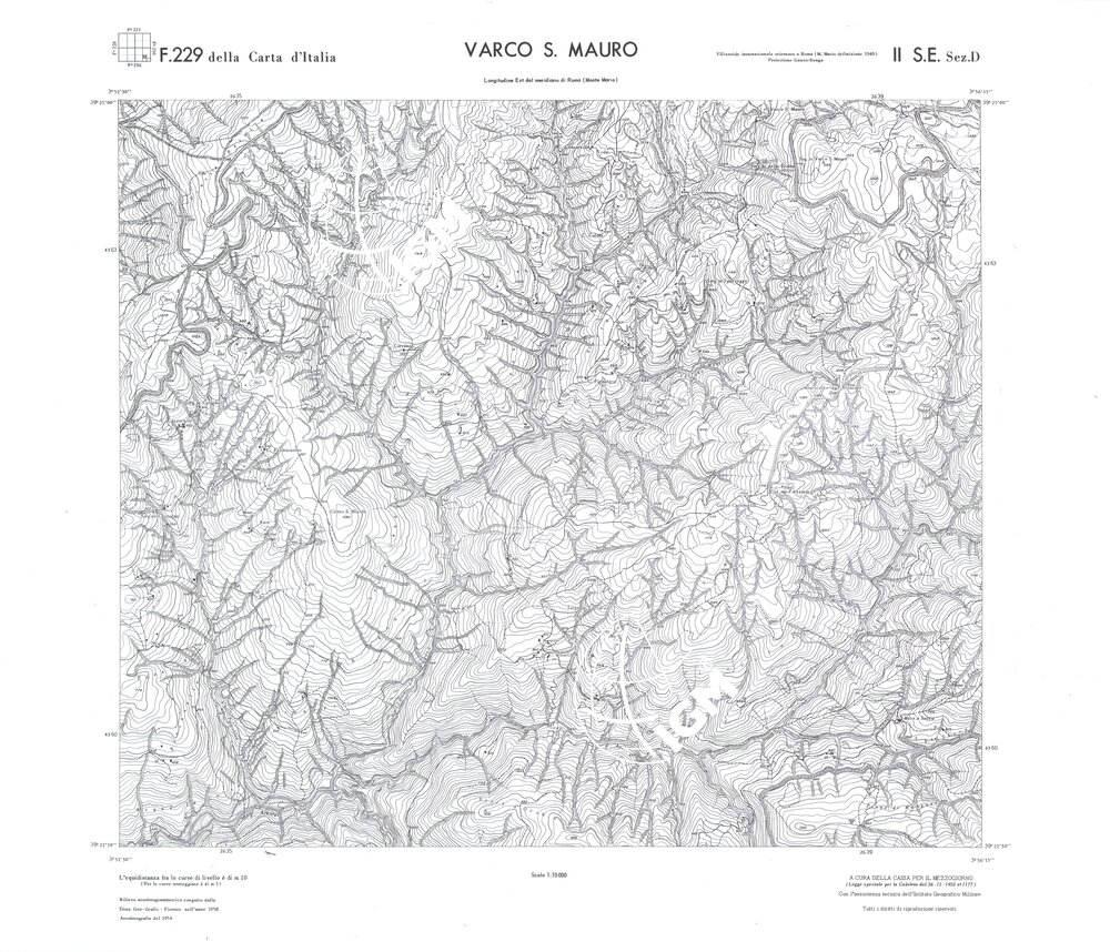 Rilievo eseguito da ditte private a cura della Cassa per il Mezzogiorno (legge speciale per la Calabria 26/11/1955 n°1177) con l’assistenza tecnica dell’ I.G.M. Rilievo aereofotogrammetrico,proiezione naturale,stampa in nero,equidistanza tra le curve mt.10. Le fotoriprese aeree furono eseguite nel 1954, l’elemento cartografico era la sezione di tavoletta, ossia 1/4 di tavoletta, distinta dalle lettere A;B;C;D.