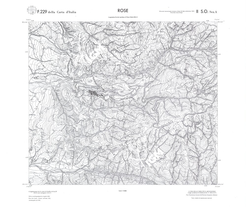 Rilievo eseguito da ditte private a cura della Cassa per il Mezzogiorno (legge speciale per la Calabria 26/11/1955 n°1177) con l’assistenza tecnica dell’ I.G.M. Rilievo aereofotogrammetrico,proiezione naturale,stampa in nero,equidistanza tra le curve mt.10. Le fotoriprese aeree furono eseguite nel 1954, l’elemento cartografico era la sezione di tavoletta, ossia 1/4 di tavoletta, distinta dalle lettere A;B;C;D.
