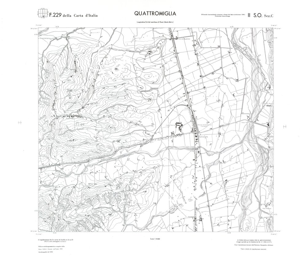 Rilievo eseguito da ditte private a cura della Cassa per il Mezzogiorno (legge speciale per la Calabria 26/11/1955 n°1177) con l’assistenza tecnica dell’ I.G.M. Rilievo aereofotogrammetrico,proiezione naturale,stampa in nero,equidistanza tra le curve mt.10. Le fotoriprese aeree furono eseguite nel 1954, l’elemento cartografico era la sezione di tavoletta, ossia 1/4 di tavoletta, distinta dalle lettere A;B;C;D.