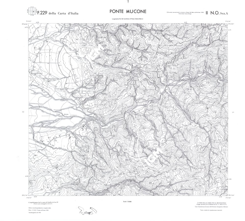 Rilievo eseguito da ditte private a cura della Cassa per il Mezzogiorno (legge speciale per la Calabria 26/11/1955 n°1177) con l’assistenza tecnica dell’ I.G.M. Rilievo aereofotogrammetrico,proiezione naturale,stampa in nero,equidistanza tra le curve mt.10. Le fotoriprese aeree furono eseguite nel 1954, l’elemento cartografico era la sezione di tavoletta, ossia 1/4 di tavoletta, distinta dalle lettere A;B;C;D.