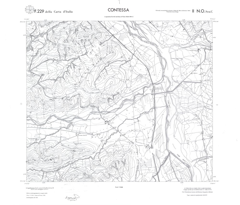 Rilievo eseguito da ditte private a cura della Cassa per il Mezzogiorno (legge speciale per la Calabria 26/11/1955 n°1177) con l’assistenza tecnica dell’ I.G.M. Rilievo aereofotogrammetrico,proiezione naturale,stampa in nero,equidistanza tra le curve mt.10. Le fotoriprese aeree furono eseguite nel 1954, l’elemento cartografico era la sezione di tavoletta, ossia 1/4 di tavoletta, distinta dalle lettere A;B;C;D.