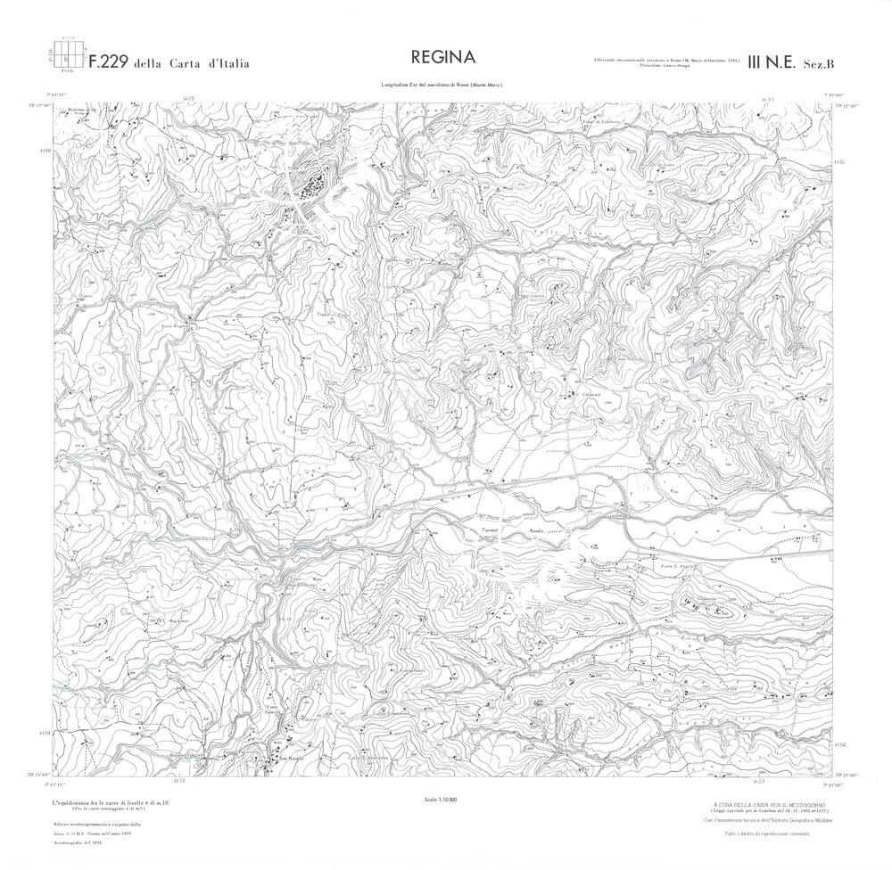 Rilievo eseguito da ditte private a cura della Cassa per il Mezzogiorno (legge speciale per la Calabria 26/11/1955 n°1177) con l’assistenza tecnica dell’ I.G.M. Rilievo aereofotogrammetrico,proiezione naturale,stampa in nero,equidistanza tra le curve mt.10. Le fotoriprese aeree furono eseguite nel 1954, l’elemento cartografico era la sezione di tavoletta, ossia 1/4 di tavoletta, distinta dalle lettere A;B;C;D.
