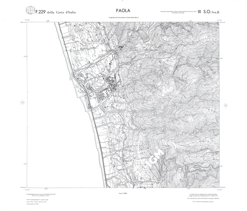 Rilievo eseguito da ditte private a cura della Cassa per il Mezzogiorno (legge speciale per la Calabria 26/11/1955 n°1177) con l’assistenza tecnica dell’ I.G.M. Rilievo aereofotogrammetrico,proiezione naturale,stampa in nero,equidistanza tra le curve mt.10. Le fotoriprese aeree furono eseguite nel 1954, l’elemento cartografico era la sezione di tavoletta, ossia 1/4 di tavoletta, distinta dalle lettere A;B;C;D.
