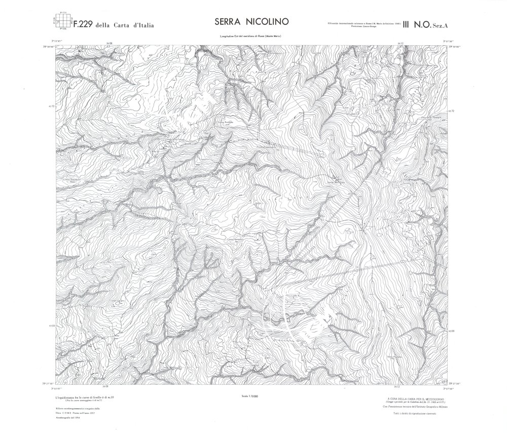 Rilievo eseguito da ditte private a cura della Cassa per il Mezzogiorno (legge speciale per la Calabria 26/11/1955 n°1177) con l’assistenza tecnica dell’ I.G.M. Rilievo aereofotogrammetrico,proiezione naturale,stampa in nero,equidistanza tra le curve mt.10. Le fotoriprese aeree furono eseguite nel 1954, l’elemento cartografico era la sezione di tavoletta, ossia 1/4 di tavoletta, distinta dalle lettere A;B;C;D.