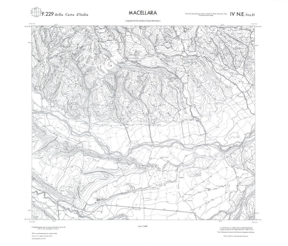 Rilievo eseguito da ditte private a cura della Cassa per il Mezzogiorno (legge speciale per la Calabria 26/11/1955 n°1177) con l’assistenza tecnica dell’ I.G.M. Rilievo aereofotogrammetrico,proiezione naturale,stampa in nero,equidistanza tra le curve mt.10. Le fotoriprese aeree furono eseguite nel 1954, l’elemento cartografico era la sezione di tavoletta, ossia 1/4 di tavoletta, distinta dalle lettere A;B;C;D.