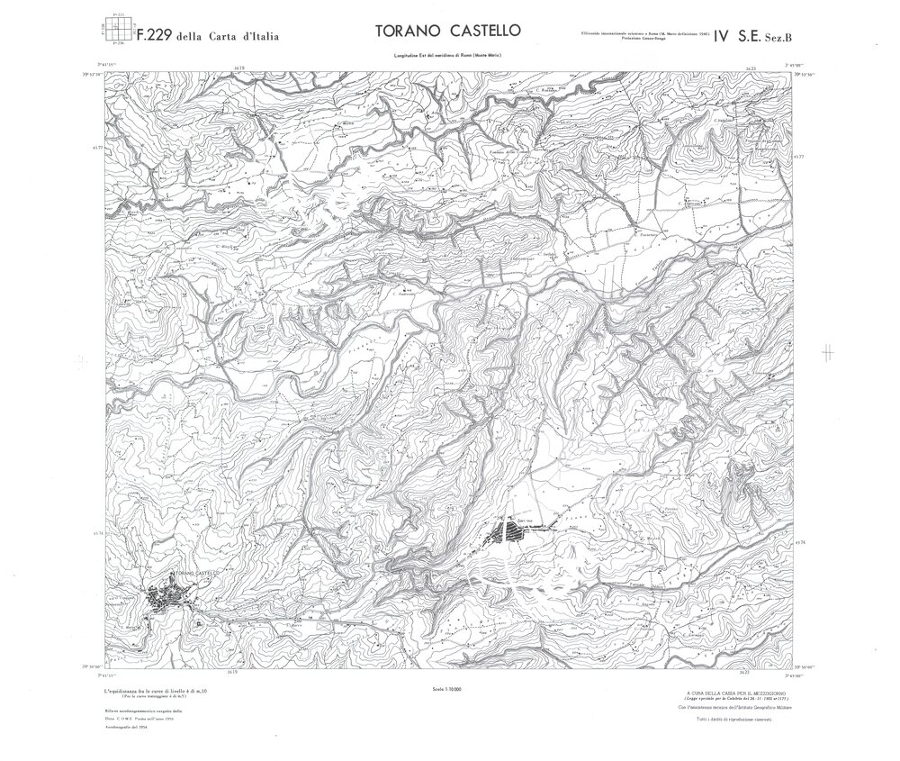 Rilievo eseguito da ditte private a cura della Cassa per il Mezzogiorno (legge speciale per la Calabria 26/11/1955 n°1177) con l’assistenza tecnica dell’ I.G.M. Rilievo aereofotogrammetrico,proiezione naturale,stampa in nero,equidistanza tra le curve mt.10. Le fotoriprese aeree furono eseguite nel 1954, l’elemento cartografico era la sezione di tavoletta, ossia 1/4 di tavoletta, distinta dalle lettere A;B;C;D.