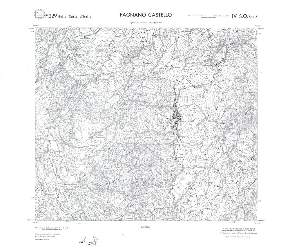 Rilievo eseguito da ditte private a cura della Cassa per il Mezzogiorno (legge speciale per la Calabria 26/11/1955 n°1177) con l’assistenza tecnica dell’ I.G.M. Rilievo aereofotogrammetrico,proiezione naturale,stampa in nero,equidistanza tra le curve mt.10. Le fotoriprese aeree furono eseguite nel 1954, l’elemento cartografico era la sezione di tavoletta, ossia 1/4 di tavoletta, distinta dalle lettere A;B;C;D.