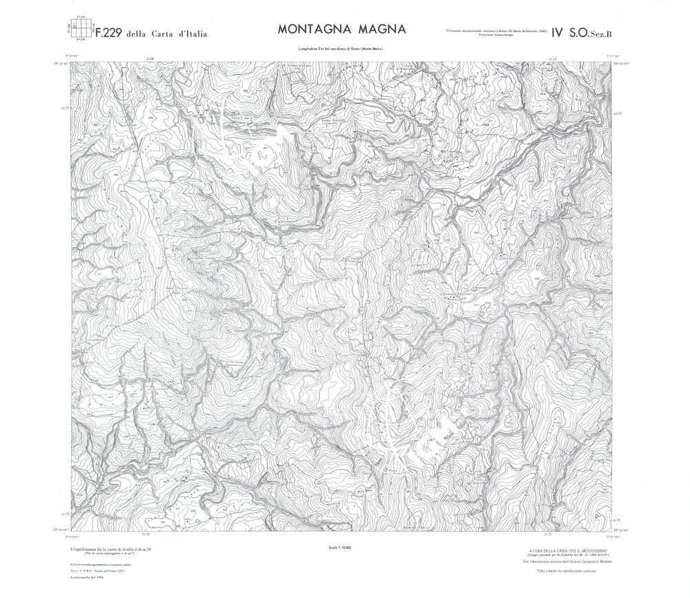 Rilievo eseguito da ditte private a cura della Cassa per il Mezzogiorno (legge speciale per la Calabria 26/11/1955 n°1177) con l’assistenza tecnica dell’ I.G.M. Rilievo aereofotogrammetrico,proiezione naturale,stampa in nero,equidistanza tra le curve mt.10. Le fotoriprese aeree furono eseguite nel 1954, l’elemento cartografico era la sezione di tavoletta, ossia 1/4 di tavoletta, distinta dalle lettere A;B;C;D.