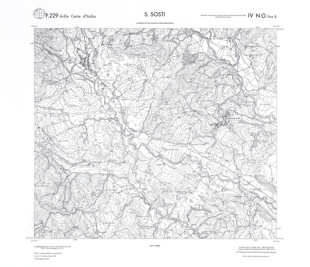 Rilievo eseguito da ditte private a cura della Cassa per il Mezzogiorno (legge speciale per la Calabria 26/11/1955 n°1177) con l’assistenza tecnica dell’ I.G.M. Rilievo aereofotogrammetrico,proiezione naturale,stampa in nero,equidistanza tra le curve mt.10. Le fotoriprese aeree furono eseguite nel 1954, l’elemento cartografico era la sezione di tavoletta, ossia 1/4 di tavoletta, distinta dalle lettere A;B;C;D.