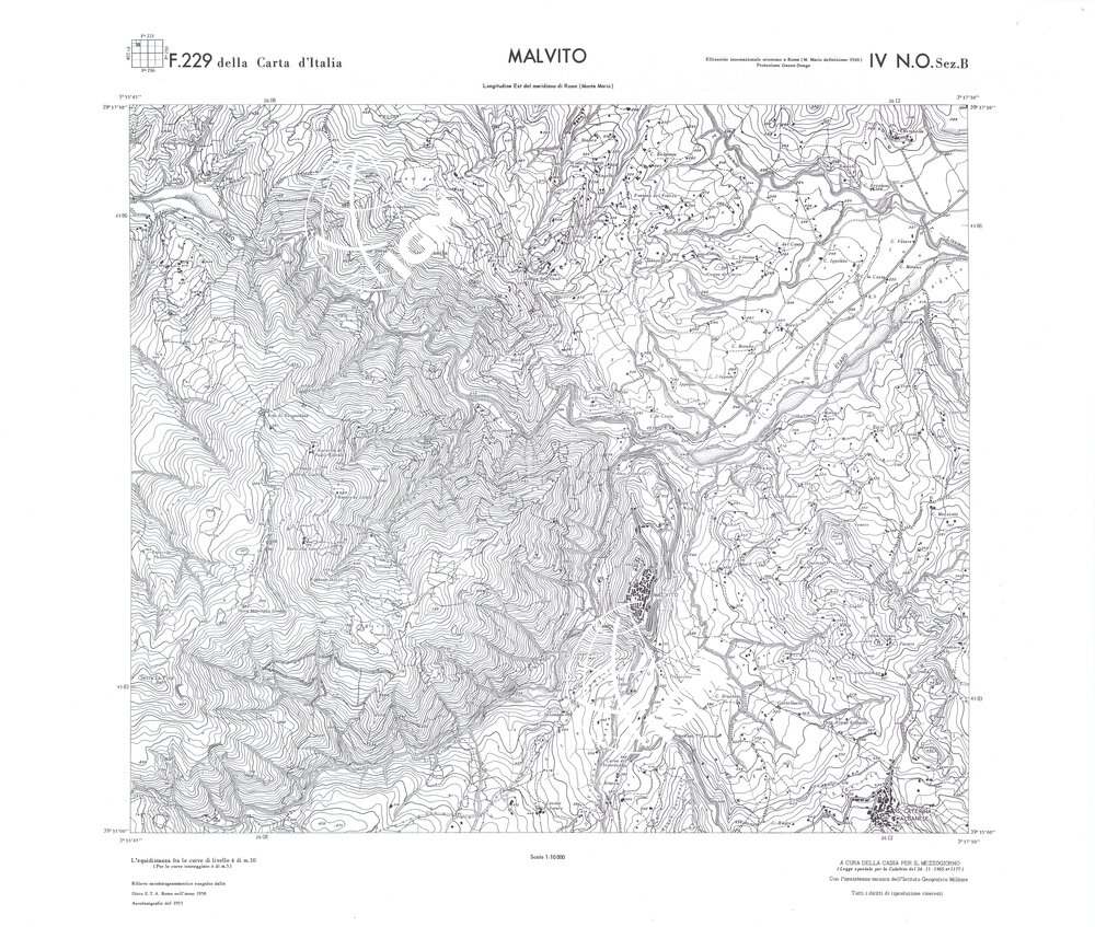 Rilievo eseguito da ditte private a cura della Cassa per il Mezzogiorno (legge speciale per la Calabria 26/11/1955 n°1177) con l’assistenza tecnica dell’ I.G.M. Rilievo aereofotogrammetrico,proiezione naturale,stampa in nero,equidistanza tra le curve mt.10. Le fotoriprese aeree furono eseguite nel 1954, l’elemento cartografico era la sezione di tavoletta, ossia 1/4 di tavoletta, distinta dalle lettere A;B;C;D.