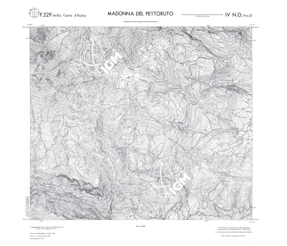 Rilievo eseguito da ditte private a cura della Cassa per il Mezzogiorno (legge speciale per la Calabria 26/11/1955 n°1177) con l’assistenza tecnica dell’ I.G.M. Rilievo aereofotogrammetrico,proiezione naturale,stampa in nero,equidistanza tra le curve mt.10. Le fotoriprese aeree furono eseguite nel 1954, l’elemento cartografico era la sezione di tavoletta, ossia 1/4 di tavoletta, distinta dalle lettere A;B;C;D.