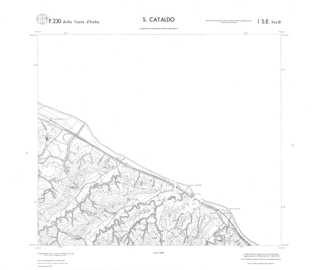 Rilievo eseguito da ditte private a cura della Cassa per il Mezzogiorno (legge speciale per la Calabria 26/11/1955 n°1177) con l’assistenza tecnica dell’ I.G.M. Rilievo aereofotogrammetrico,proiezione naturale,stampa in nero,equidistanza tra le curve mt.10. Le fotoriprese aeree furono eseguite nel 1954, l’elemento cartografico era la sezione di tavoletta, ossia 1/4 di tavoletta, distinta dalle lettere A;B;C;D.