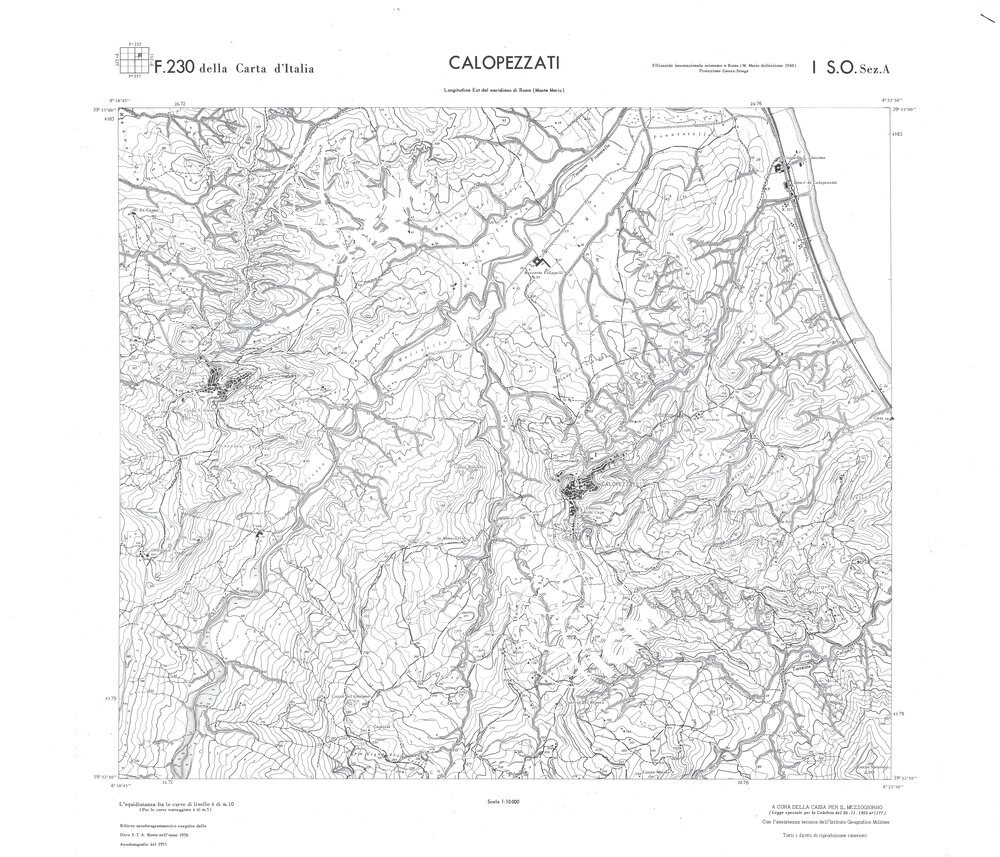 Rilievo eseguito da ditte private a cura della Cassa per il Mezzogiorno (legge speciale per la Calabria 26/11/1955 n°1177) con l’assistenza tecnica dell’ I.G.M. Rilievo aereofotogrammetrico,proiezione naturale,stampa in nero,equidistanza tra le curve mt.10. Le fotoriprese aeree furono eseguite nel 1954, l’elemento cartografico era la sezione di tavoletta, ossia 1/4 di tavoletta, distinta dalle lettere A;B;C;D.