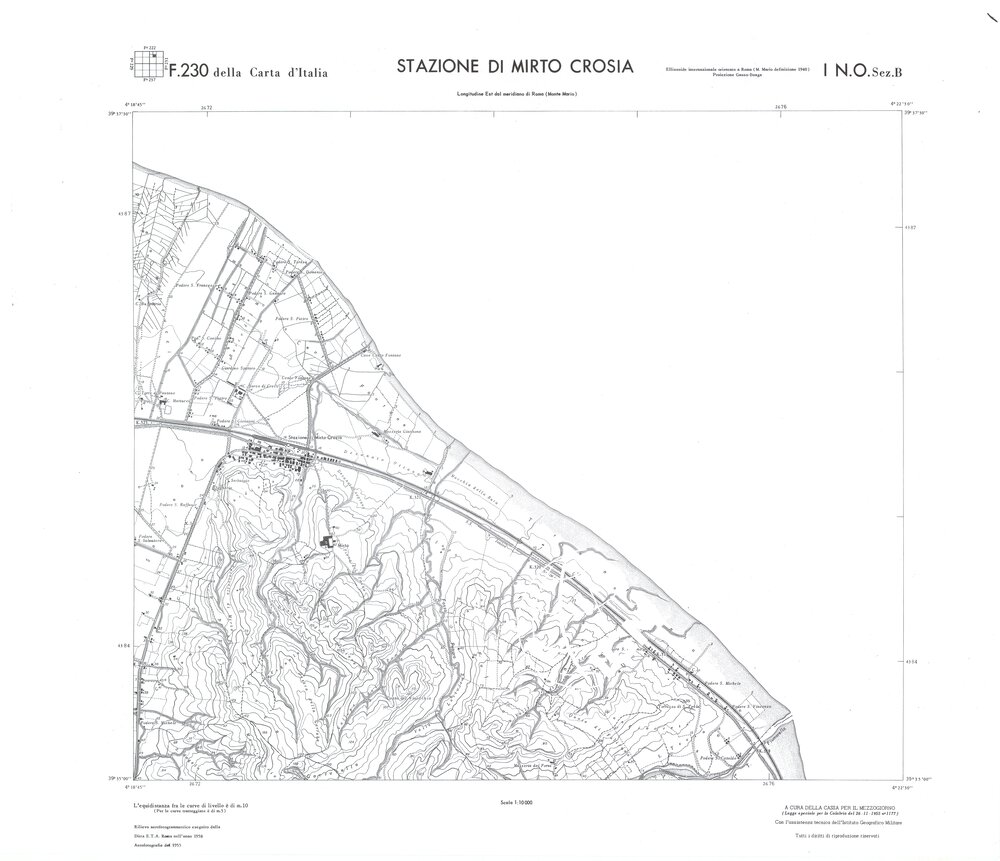 Rilievo eseguito da ditte private a cura della Cassa per il Mezzogiorno (legge speciale per la Calabria 26/11/1955 n°1177) con l’assistenza tecnica dell’ I.G.M. Rilievo aereofotogrammetrico,proiezione naturale,stampa in nero,equidistanza tra le curve mt.10. Le fotoriprese aeree furono eseguite nel 1954, l’elemento cartografico era la sezione di tavoletta, ossia 1/4 di tavoletta, distinta dalle lettere A;B;C;D.