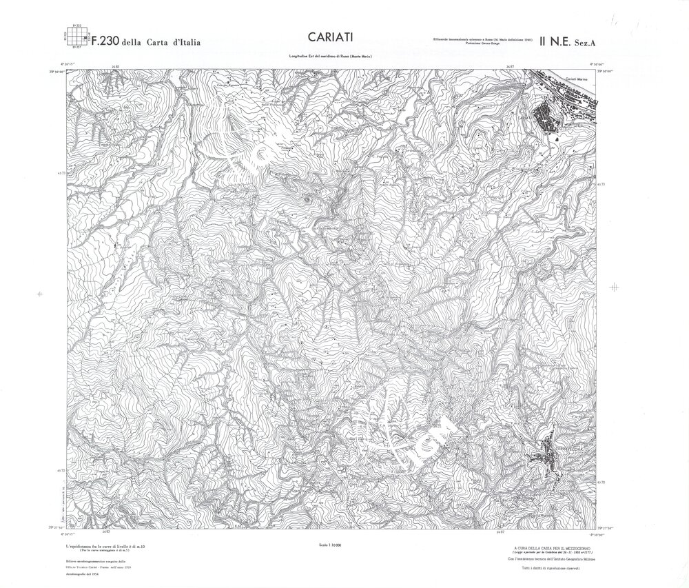 Rilievo eseguito da ditte private a cura della Cassa per il Mezzogiorno (legge speciale per la Calabria 26/11/1955 n°1177) con l’assistenza tecnica dell’ I.G.M. Rilievo aereofotogrammetrico,proiezione naturale,stampa in nero,equidistanza tra le curve mt.10. Le fotoriprese aeree furono eseguite nel 1954, l’elemento cartografico era la sezione di tavoletta, ossia 1/4 di tavoletta, distinta dalle lettere A;B;C;D.