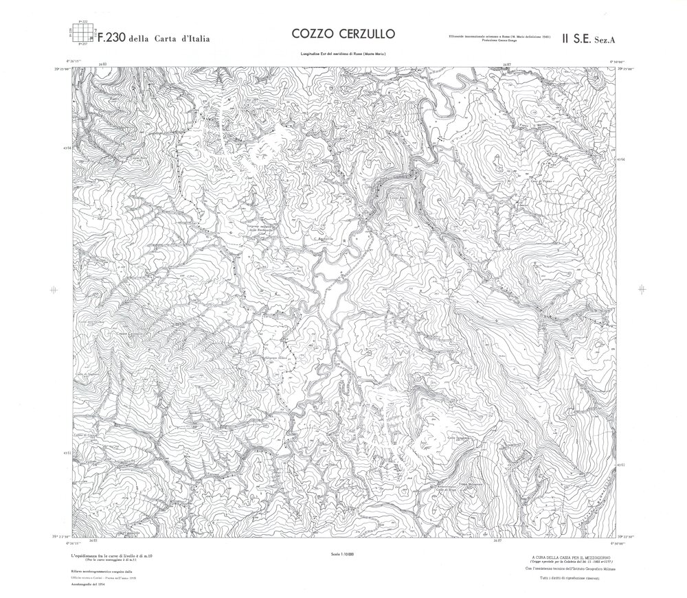 Rilievo eseguito da ditte private a cura della Cassa per il Mezzogiorno (legge speciale per la Calabria 26/11/1955 n°1177) con l’assistenza tecnica dell’ I.G.M. Rilievo aereofotogrammetrico,proiezione naturale,stampa in nero,equidistanza tra le curve mt.10. Le fotoriprese aeree furono eseguite nel 1954, l’elemento cartografico era la sezione di tavoletta, ossia 1/4 di tavoletta, distinta dalle lettere A;B;C;D.