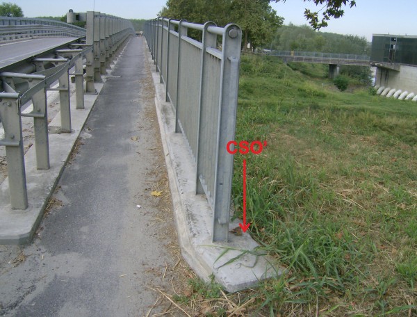 | Contrassegni | [{"simbolo_contrassegno":"B1","materializzazione":"(CSO) – Bullone infisso esternamente al muro destro, presso l'angolo, della passerella adiacente la cabina del Consorzio di Bonifica Emilia Centrale"},{"simbolo_contrassegno":"B2","materializzazione":"(CSO') – Centrino ARPA sul cordolo del parapetto del ponte. Lato valle riva destra, a 50 cm dall'estremo"}] |