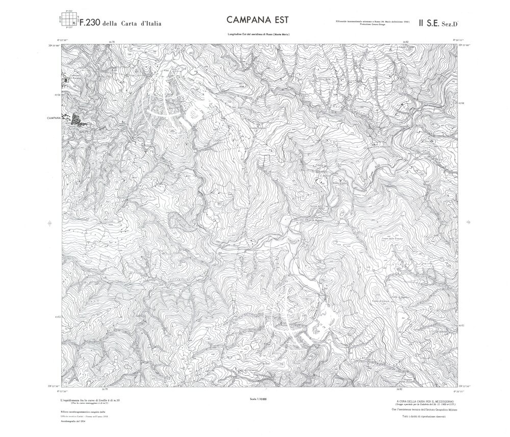 Rilievo eseguito da ditte private a cura della Cassa per il Mezzogiorno (legge speciale per la Calabria 26/11/1955 n°1177) con l’assistenza tecnica dell’ I.G.M. Rilievo aereofotogrammetrico,proiezione naturale,stampa in nero,equidistanza tra le curve mt.10. Le fotoriprese aeree furono eseguite nel 1954, l’elemento cartografico era la sezione di tavoletta, ossia 1/4 di tavoletta, distinta dalle lettere A;B;C;D.