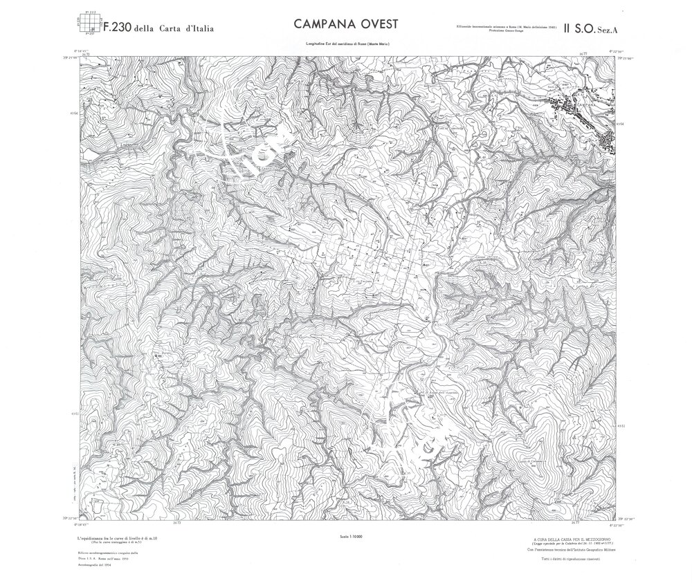 Rilievo eseguito da ditte private a cura della Cassa per il Mezzogiorno (legge speciale per la Calabria 26/11/1955 n°1177) con l’assistenza tecnica dell’ I.G.M. Rilievo aereofotogrammetrico,proiezione naturale,stampa in nero,equidistanza tra le curve mt.10. Le fotoriprese aeree furono eseguite nel 1954, l’elemento cartografico era la sezione di tavoletta, ossia 1/4 di tavoletta, distinta dalle lettere A;B;C;D.