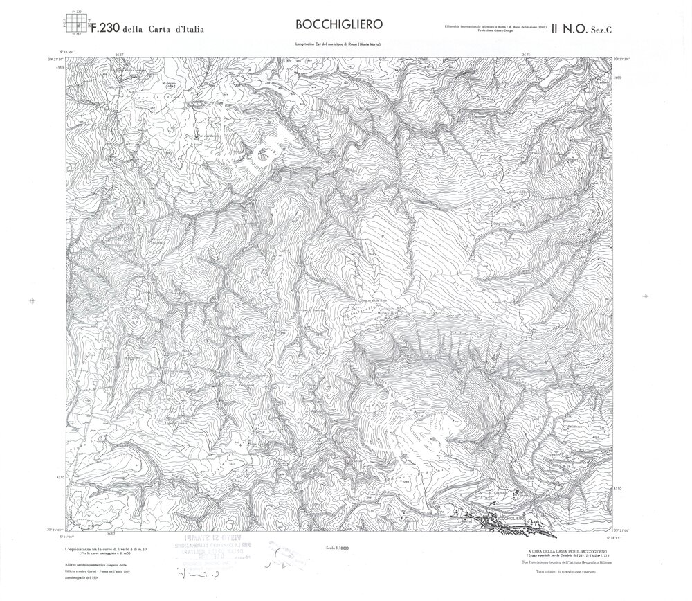 Rilievo eseguito da ditte private a cura della Cassa per il Mezzogiorno (legge speciale per la Calabria 26/11/1955 n°1177) con l’assistenza tecnica dell’ I.G.M. Rilievo aereofotogrammetrico,proiezione naturale,stampa in nero,equidistanza tra le curve mt.10. Le fotoriprese aeree furono eseguite nel 1954, l’elemento cartografico era la sezione di tavoletta, ossia 1/4 di tavoletta, distinta dalle lettere A;B;C;D.