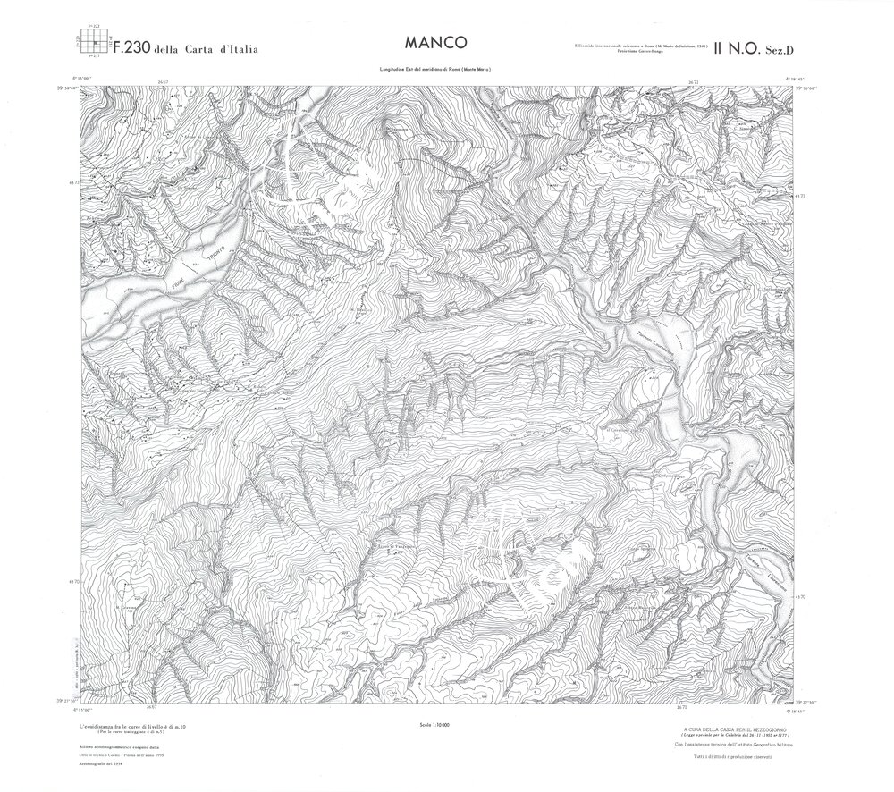Rilievo eseguito da ditte private a cura della Cassa per il Mezzogiorno (legge speciale per la Calabria 26/11/1955 n°1177) con l’assistenza tecnica dell’ I.G.M. Rilievo aereofotogrammetrico,proiezione naturale,stampa in nero,equidistanza tra le curve mt.10. Le fotoriprese aeree furono eseguite nel 1954, l’elemento cartografico era la sezione di tavoletta, ossia 1/4 di tavoletta, distinta dalle lettere A;B;C;D.