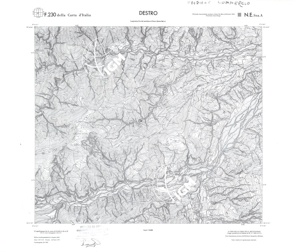 Rilievo eseguito da ditte private a cura della Cassa per il Mezzogiorno (legge speciale per la Calabria 26/11/1955 n°1177) con l’assistenza tecnica dell’ I.G.M. Rilievo aereofotogrammetrico,proiezione naturale,stampa in nero,equidistanza tra le curve mt.10. Le fotoriprese aeree furono eseguite nel 1954, l’elemento cartografico era la sezione di tavoletta, ossia 1/4 di tavoletta, distinta dalle lettere A;B;C;D.