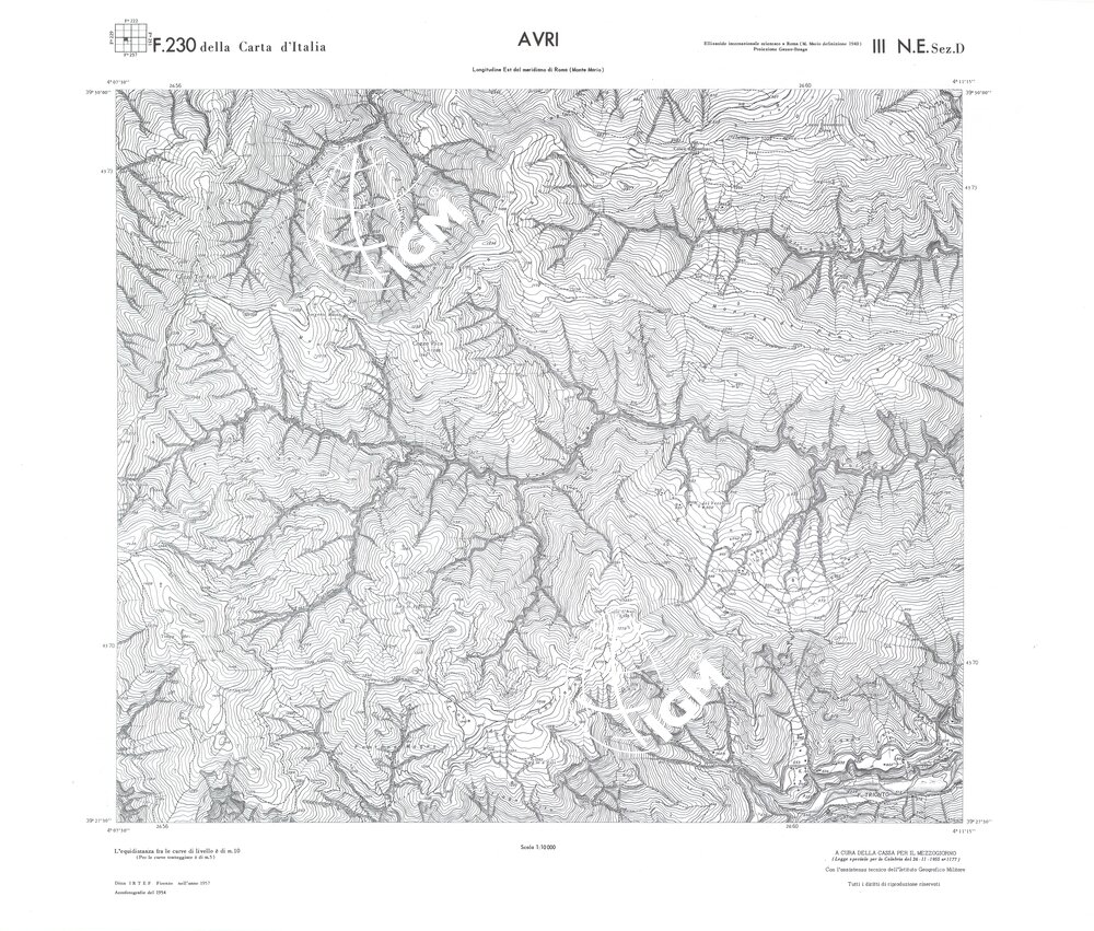 Rilievo eseguito da ditte private a cura della Cassa per il Mezzogiorno (legge speciale per la Calabria 26/11/1955 n°1177) con l’assistenza tecnica dell’ I.G.M. Rilievo aereofotogrammetrico,proiezione naturale,stampa in nero,equidistanza tra le curve mt.10. Le fotoriprese aeree furono eseguite nel 1954, l’elemento cartografico era la sezione di tavoletta, ossia 1/4 di tavoletta, distinta dalle lettere A;B;C;D.