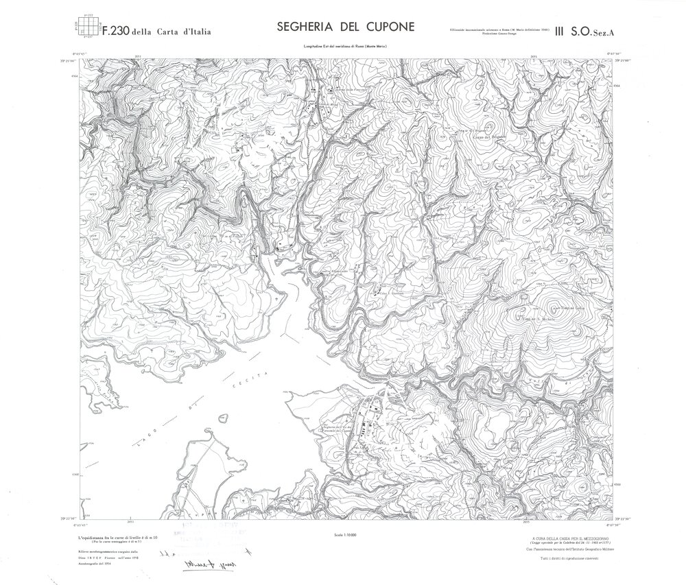 Rilievo eseguito da ditte private a cura della Cassa per il Mezzogiorno (legge speciale per la Calabria 26/11/1955 n°1177) con l’assistenza tecnica dell’ I.G.M. Rilievo aereofotogrammetrico,proiezione naturale,stampa in nero,equidistanza tra le curve mt.10. Le fotoriprese aeree furono eseguite nel 1954, l’elemento cartografico era la sezione di tavoletta, ossia 1/4 di tavoletta, distinta dalle lettere A;B;C;D.
