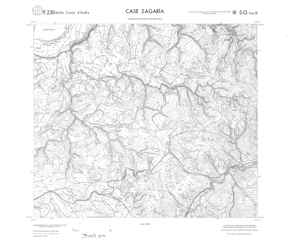 Rilievo eseguito da ditte private a cura della Cassa per il Mezzogiorno (legge speciale per la Calabria 26/11/1955 n°1177) con l’assistenza tecnica dell’ I.G.M. Rilievo aereofotogrammetrico,proiezione naturale,stampa in nero,equidistanza tra le curve mt.10. Le fotoriprese aeree furono eseguite nel 1954, l’elemento cartografico era la sezione di tavoletta, ossia 1/4 di tavoletta, distinta dalle lettere A;B;C;D.