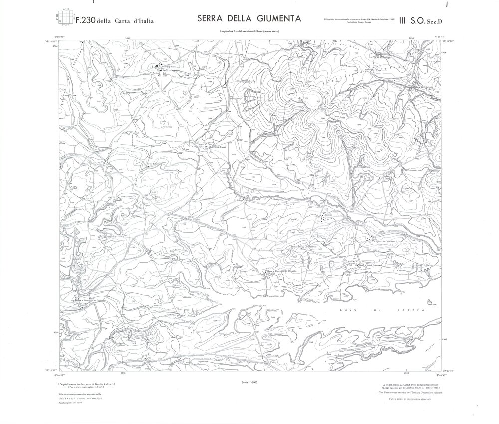 Rilievo eseguito da ditte private a cura della Cassa per il Mezzogiorno (legge speciale per la Calabria 26/11/1955 n°1177) con l’assistenza tecnica dell’ I.G.M. Rilievo aereofotogrammetrico,proiezione naturale,stampa in nero,equidistanza tra le curve mt.10. Le fotoriprese aeree furono eseguite nel 1954, l’elemento cartografico era la sezione di tavoletta, ossia 1/4 di tavoletta, distinta dalle lettere A;B;C;D.