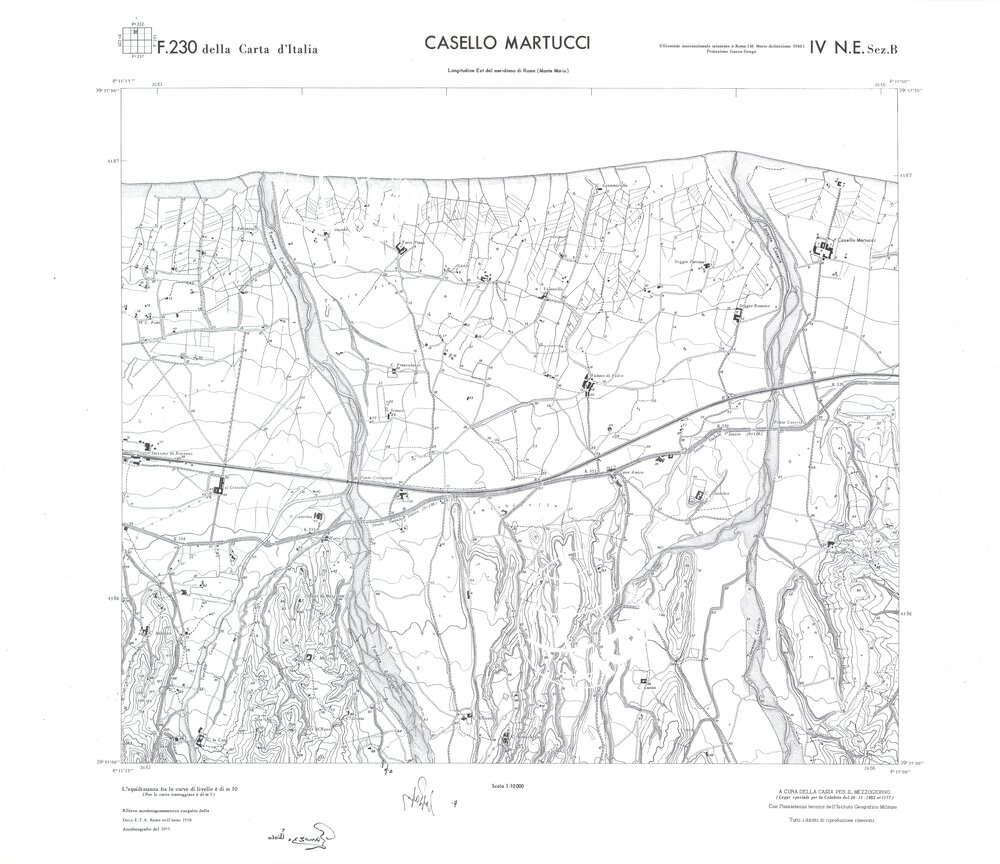 Rilievo eseguito da ditte private a cura della Cassa per il Mezzogiorno (legge speciale per la Calabria 26/11/1955 n°1177) con l’assistenza tecnica dell’ I.G.M. Rilievo aereofotogrammetrico,proiezione naturale,stampa in nero,equidistanza tra le curve mt.10. Le fotoriprese aeree furono eseguite nel 1954, l’elemento cartografico era la sezione di tavoletta, ossia 1/4 di tavoletta, distinta dalle lettere A;B;C;D.
