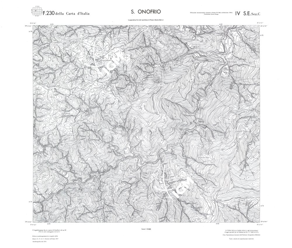 Rilievo eseguito da ditte private a cura della Cassa per il Mezzogiorno (legge speciale per la Calabria 26/11/1955 n°1177) con l’assistenza tecnica dell’ I.G.M. Rilievo aereofotogrammetrico,proiezione naturale,stampa in nero,equidistanza tra le curve mt.10. Le fotoriprese aeree furono eseguite nel 1954, l’elemento cartografico era la sezione di tavoletta, ossia 1/4 di tavoletta, distinta dalle lettere A;B;C;D.