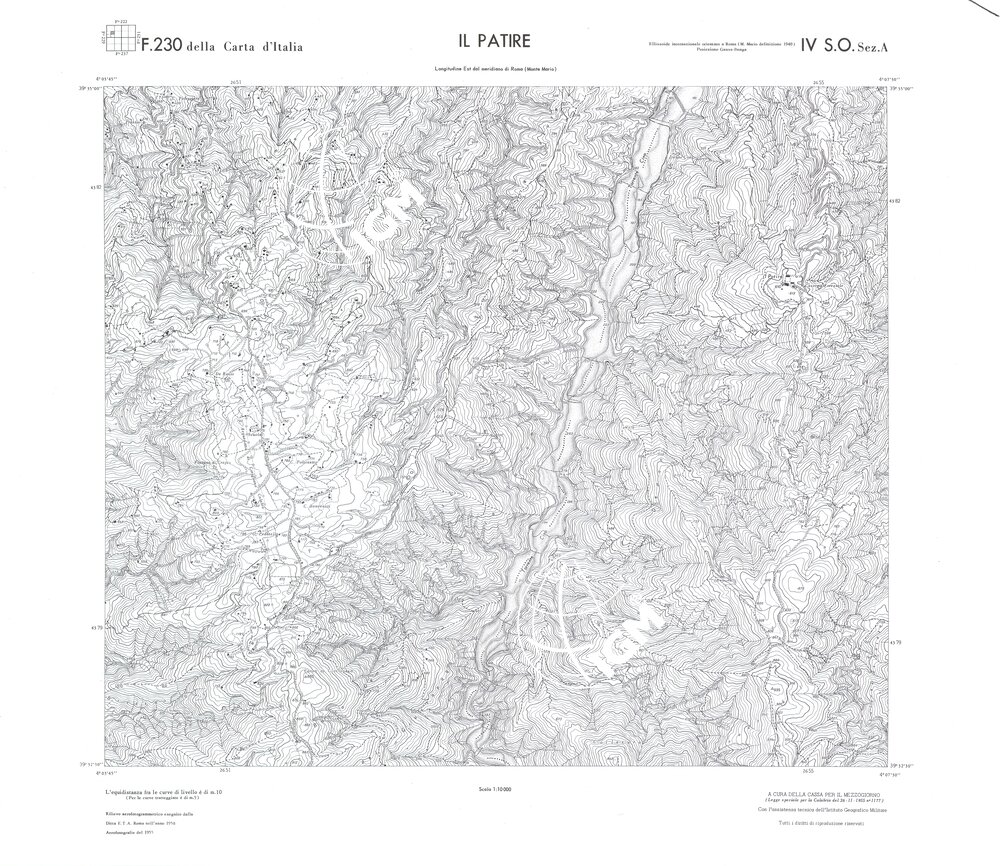 Rilievo eseguito da ditte private a cura della Cassa per il Mezzogiorno (legge speciale per la Calabria 26/11/1955 n°1177) con l’assistenza tecnica dell’ I.G.M. Rilievo aereofotogrammetrico,proiezione naturale,stampa in nero,equidistanza tra le curve mt.10. Le fotoriprese aeree furono eseguite nel 1954, l’elemento cartografico era la sezione di tavoletta, ossia 1/4 di tavoletta, distinta dalle lettere A;B;C;D.