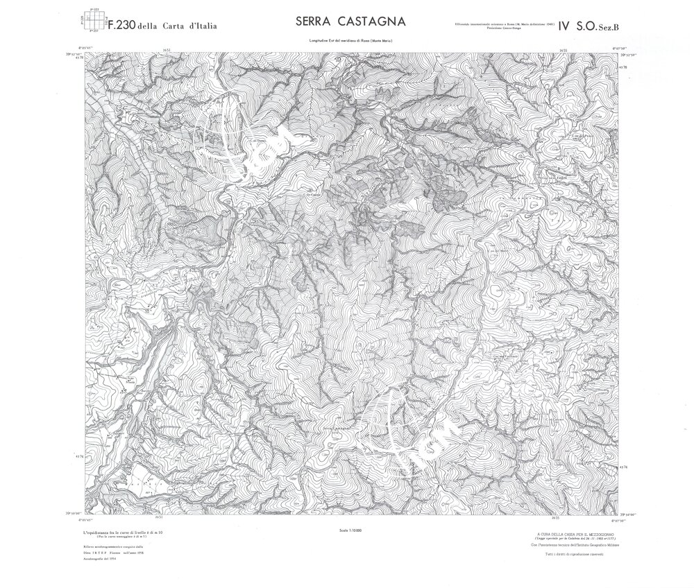Rilievo eseguito da ditte private a cura della Cassa per il Mezzogiorno (legge speciale per la Calabria 26/11/1955 n°1177) con l’assistenza tecnica dell’ I.G.M. Rilievo aereofotogrammetrico,proiezione naturale,stampa in nero,equidistanza tra le curve mt.10. Le fotoriprese aeree furono eseguite nel 1954, l’elemento cartografico era la sezione di tavoletta, ossia 1/4 di tavoletta, distinta dalle lettere A;B;C;D.
