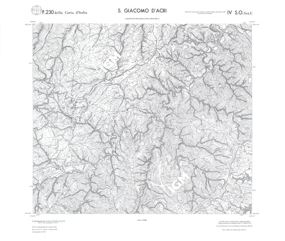 Rilievo eseguito da ditte private a cura della Cassa per il Mezzogiorno (legge speciale per la Calabria 26/11/1955 n°1177) con l’assistenza tecnica dell’ I.G.M. Rilievo aereofotogrammetrico,proiezione naturale,stampa in nero,equidistanza tra le curve mt.10. Le fotoriprese aeree furono eseguite nel 1954, l’elemento cartografico era la sezione di tavoletta, ossia 1/4 di tavoletta, distinta dalle lettere A;B;C;D.
