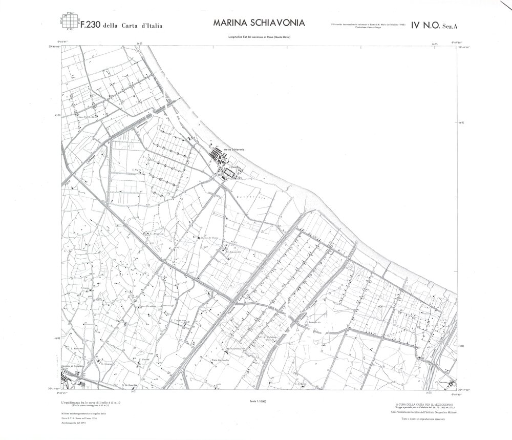 Rilievo eseguito da ditte private a cura della Cassa per il Mezzogiorno (legge speciale per la Calabria 26/11/1955 n°1177) con l’assistenza tecnica dell’ I.G.M. Rilievo aereofotogrammetrico,proiezione naturale,stampa in nero,equidistanza tra le curve mt.10. Le fotoriprese aeree furono eseguite nel 1954, l’elemento cartografico era la sezione di tavoletta, ossia 1/4 di tavoletta, distinta dalle lettere A;B;C;D.