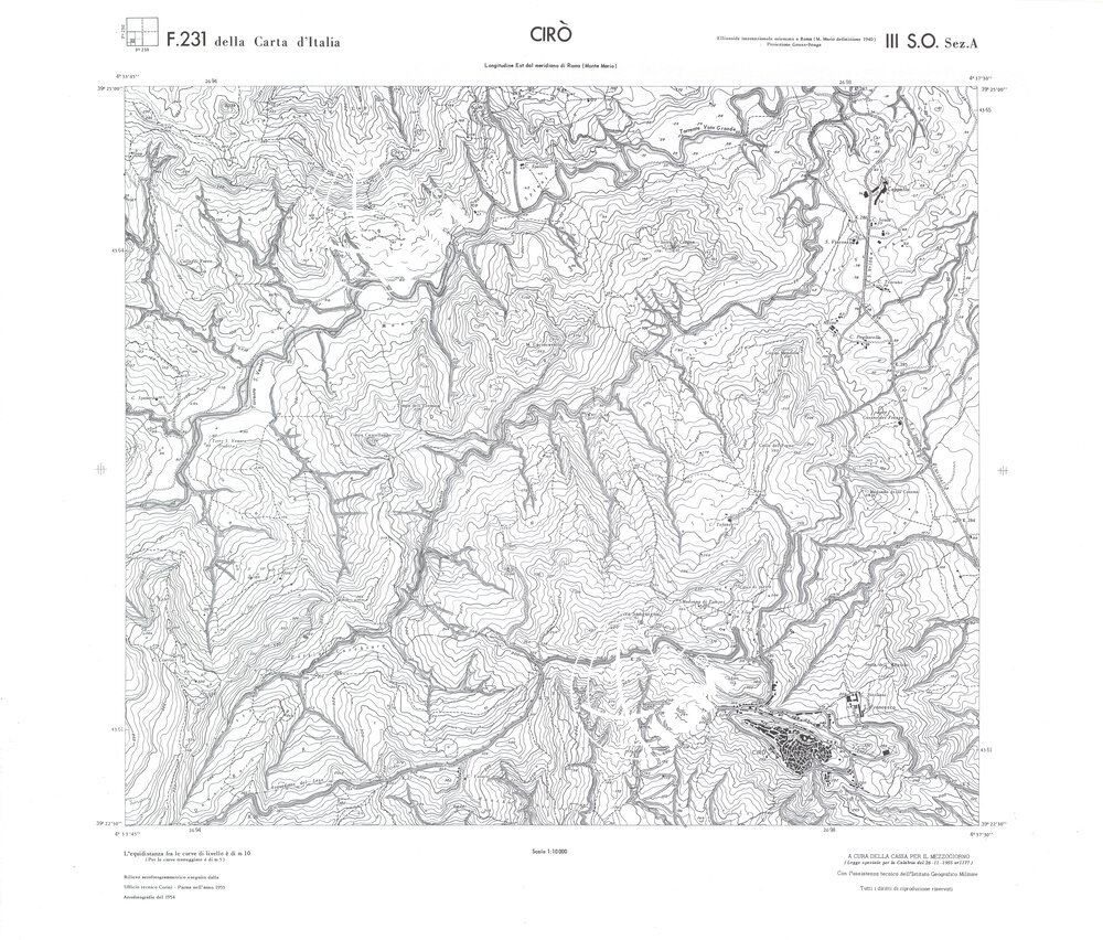 Rilievo eseguito da ditte private a cura della Cassa per il Mezzogiorno (legge speciale per la Calabria 26/11/1955 n°1177) con l’assistenza tecnica dell’ I.G.M. Rilievo aereofotogrammetrico,proiezione naturale,stampa in nero,equidistanza tra le curve mt.10. Le fotoriprese aeree furono eseguite nel 1954, l’elemento cartografico era la sezione di tavoletta, ossia 1/4 di tavoletta, distinta dalle lettere A;B;C;D.