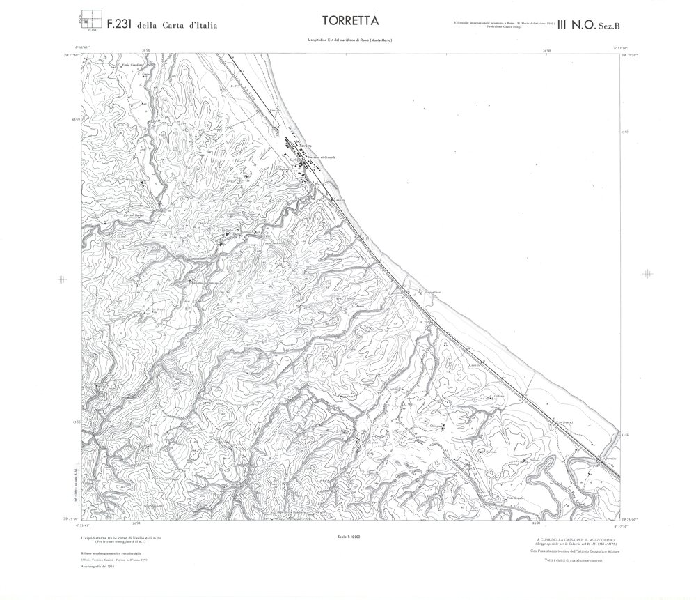 Rilievo eseguito da ditte private a cura della Cassa per il Mezzogiorno (legge speciale per la Calabria 26/11/1955 n°1177) con l’assistenza tecnica dell’ I.G.M. Rilievo aereofotogrammetrico,proiezione naturale,stampa in nero,equidistanza tra le curve mt.10. Le fotoriprese aeree furono eseguite nel 1954, l’elemento cartografico era la sezione di tavoletta, ossia 1/4 di tavoletta, distinta dalle lettere A;B;C;D.
