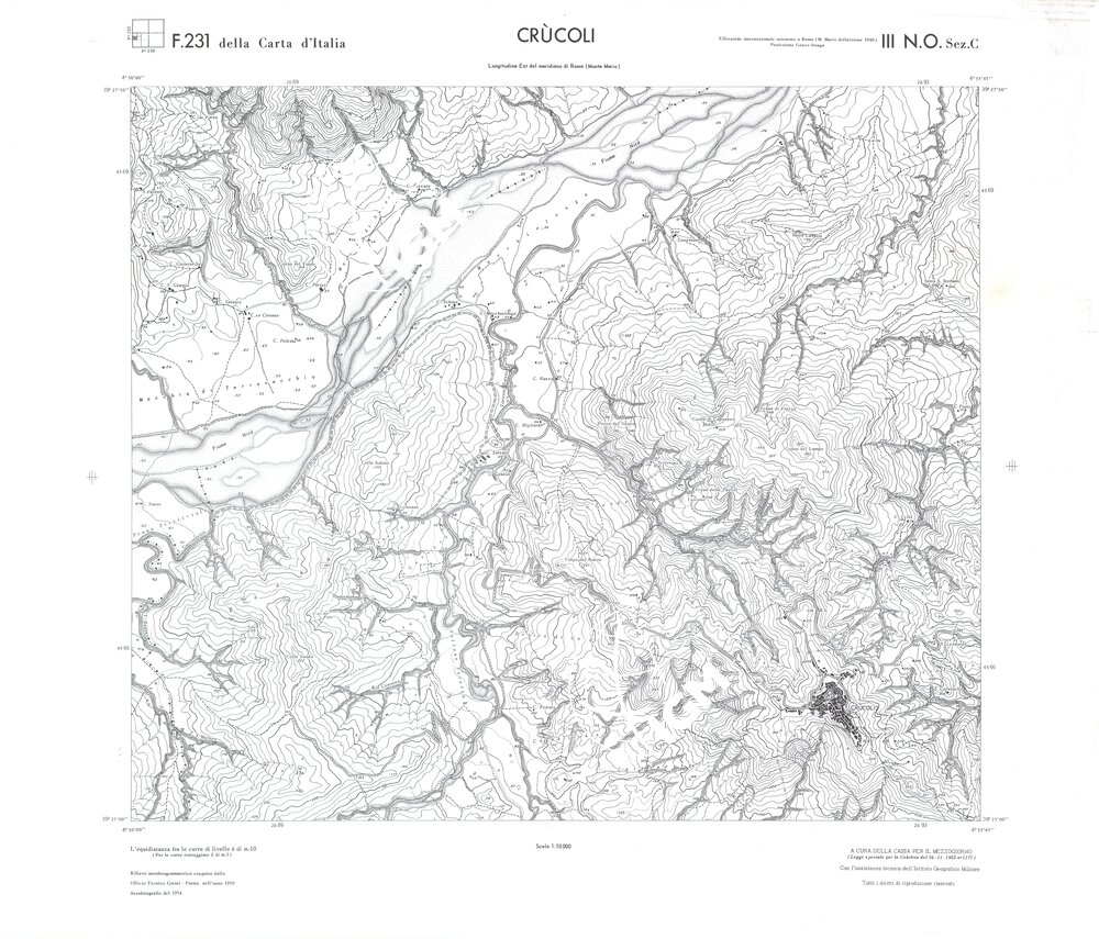 Rilievo eseguito da ditte private a cura della Cassa per il Mezzogiorno (legge speciale per la Calabria 26/11/1955 n°1177) con l’assistenza tecnica dell’ I.G.M. Rilievo aereofotogrammetrico,proiezione naturale,stampa in nero,equidistanza tra le curve mt.10. Le fotoriprese aeree furono eseguite nel 1954, l’elemento cartografico era la sezione di tavoletta, ossia 1/4 di tavoletta, distinta dalle lettere A;B;C;D.