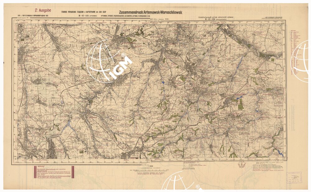 RUSSIA – RUSSISCHE KARTE (RIPRODUZIONE TEDESCA DELLA CARTA ORIGINALE DELLO S.M. DELL’ESERCITO ROSSO) Foglio M-37-125 Artemowsk, Foglio M-37-126 Woroschilowsk