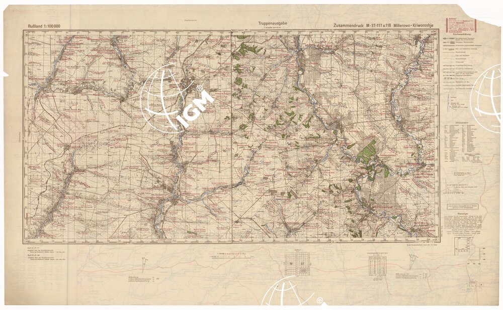 RUSSIA – RUSSISCHE KARTE (RIPRODUZIONE TEDESCA DELLA CARTA ORIGINALE DELLO S.M. DELL’ESERCITO ROSSO) Foglio M-37-117 Millerowo, Foglio M-37-118 Kriworoshje
